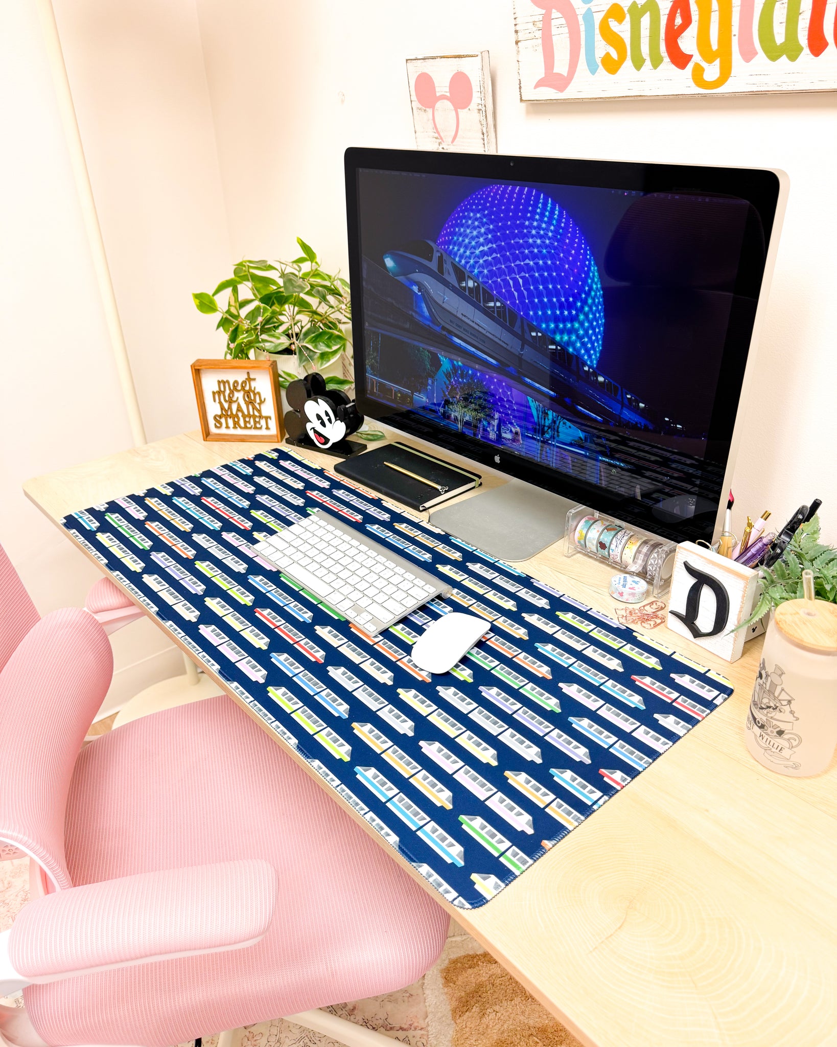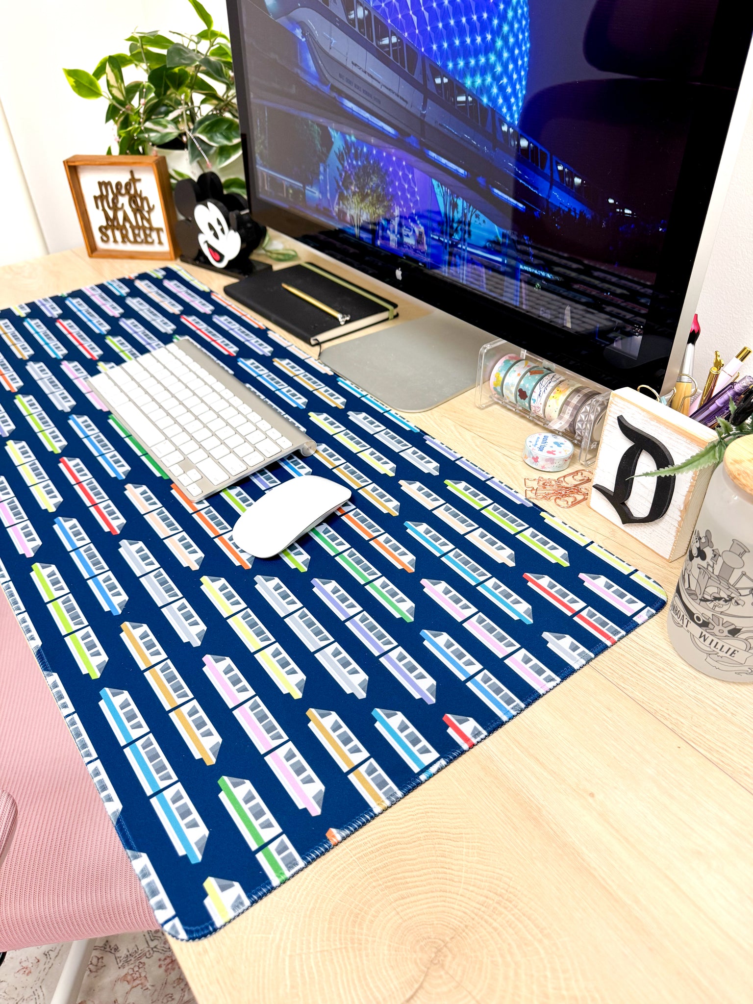 The most iconic ride at Disney World! This Monorail themed desk mat features a variety of monorail colors on a dark blue background to protect your desk from any stains and scratches. Its non-slip rubber backing and smooth, low friction surface make for comfortable and precise mouse movements while keeping a firm surface that's still perfect for any pen and pencil moments.