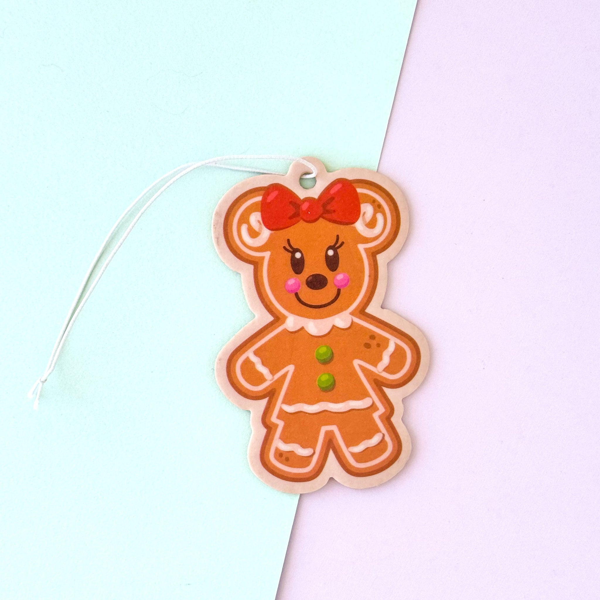 The most magical holiday gingerbread duo with Gingerbread Mickey and Gingerbread Minnie! This is a double sided air freshener with one side as Mickey and one side as Minnie. Scent is in Vanilla Cookies.