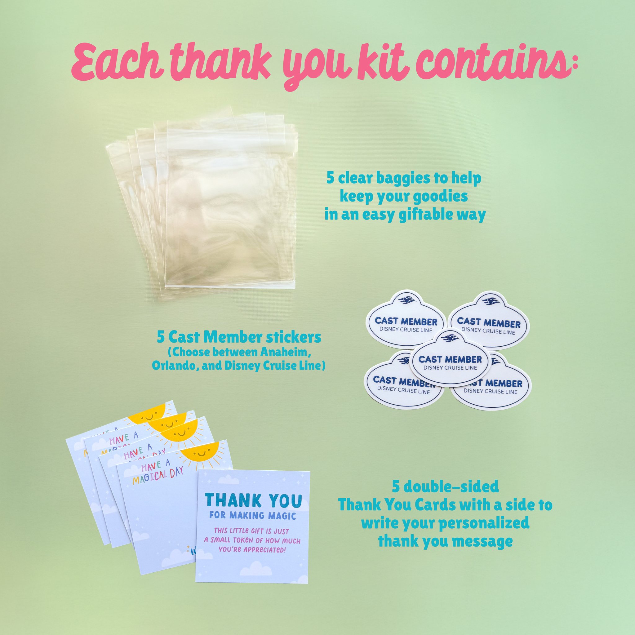 A 5-pack of square Thank You cards and matching Cast Member stickers, along with 5 baggies so you can easily show cast members your appreciation! There's also space for writing a personal note on the card.