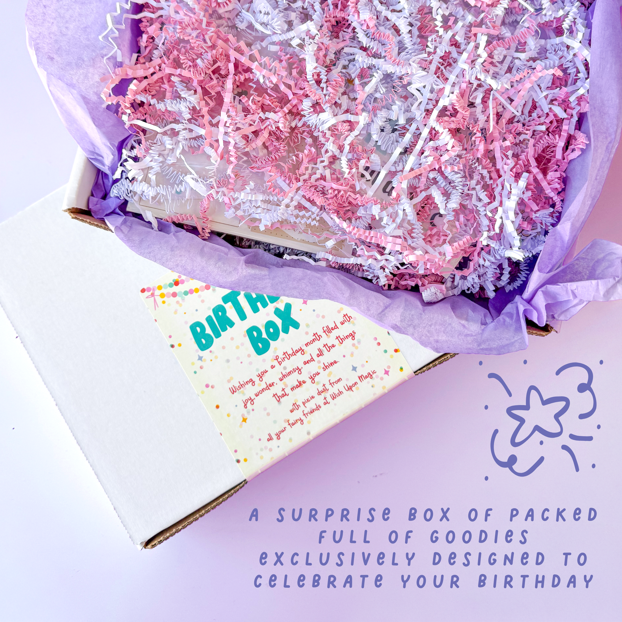 A birthday box packed with celebratory designs for the most magical birthday ever! All the designs in this box are exclusive only to the box and found no where else in the shop featuring a variety of ! Each box is the same and contains items valued at over $60. Perfect for yourself or to a friend who is celebrating a birthday!