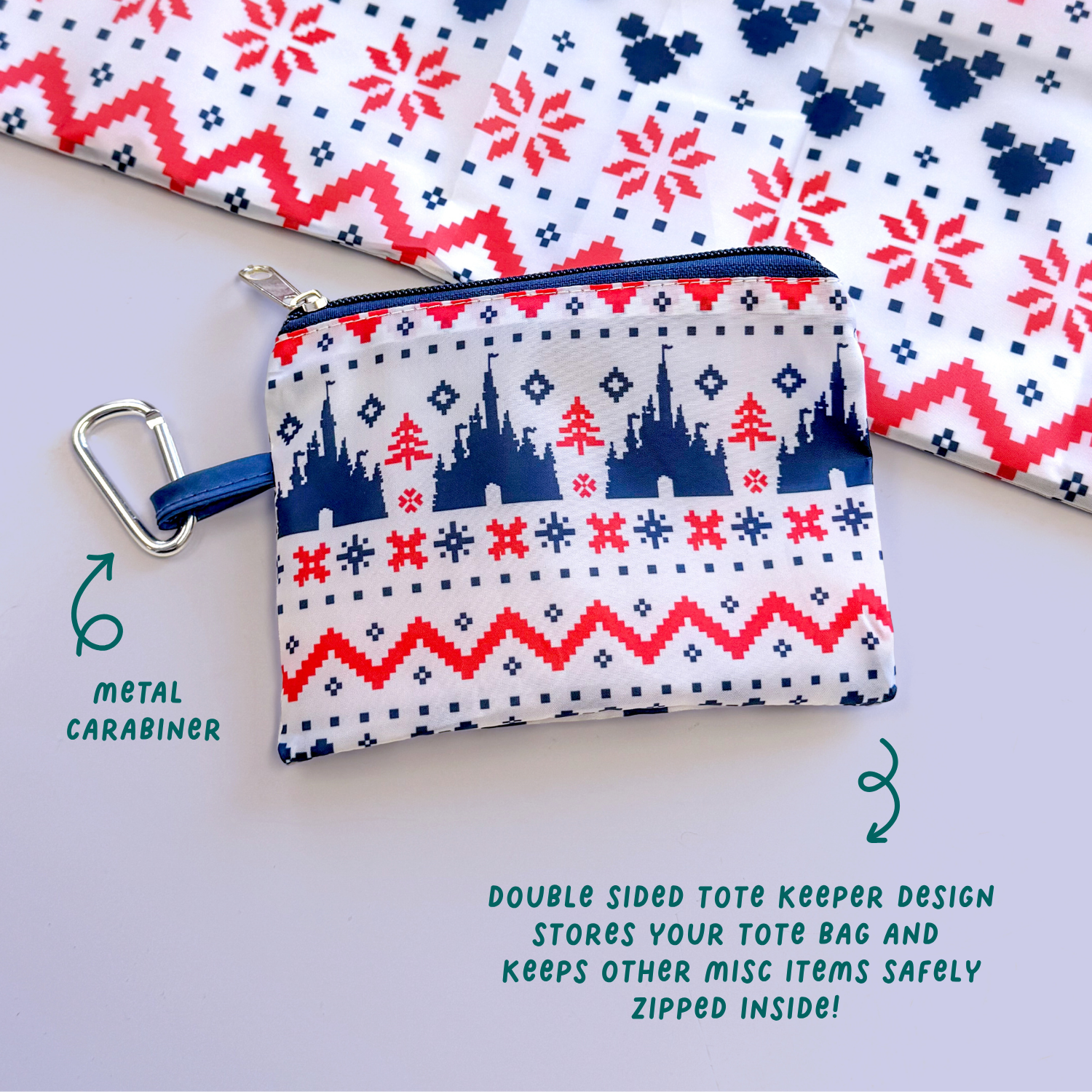 This holiday reusable tote is perfect to carry all the snacks and holiday shopping this season! Custom designed with castles and hidden Mickeys in a subtle Christmas vibe, this tote is made as extra large capacity to hold gallons of milk and cookies for Santa and all the elves in the workshop, featuring longer-than-standard and super wide straps for easy shoulder carrying and improved weight distribution for added comfort. Each Tote Bag stores away in the matching, zippered Mini Tote Keeper.