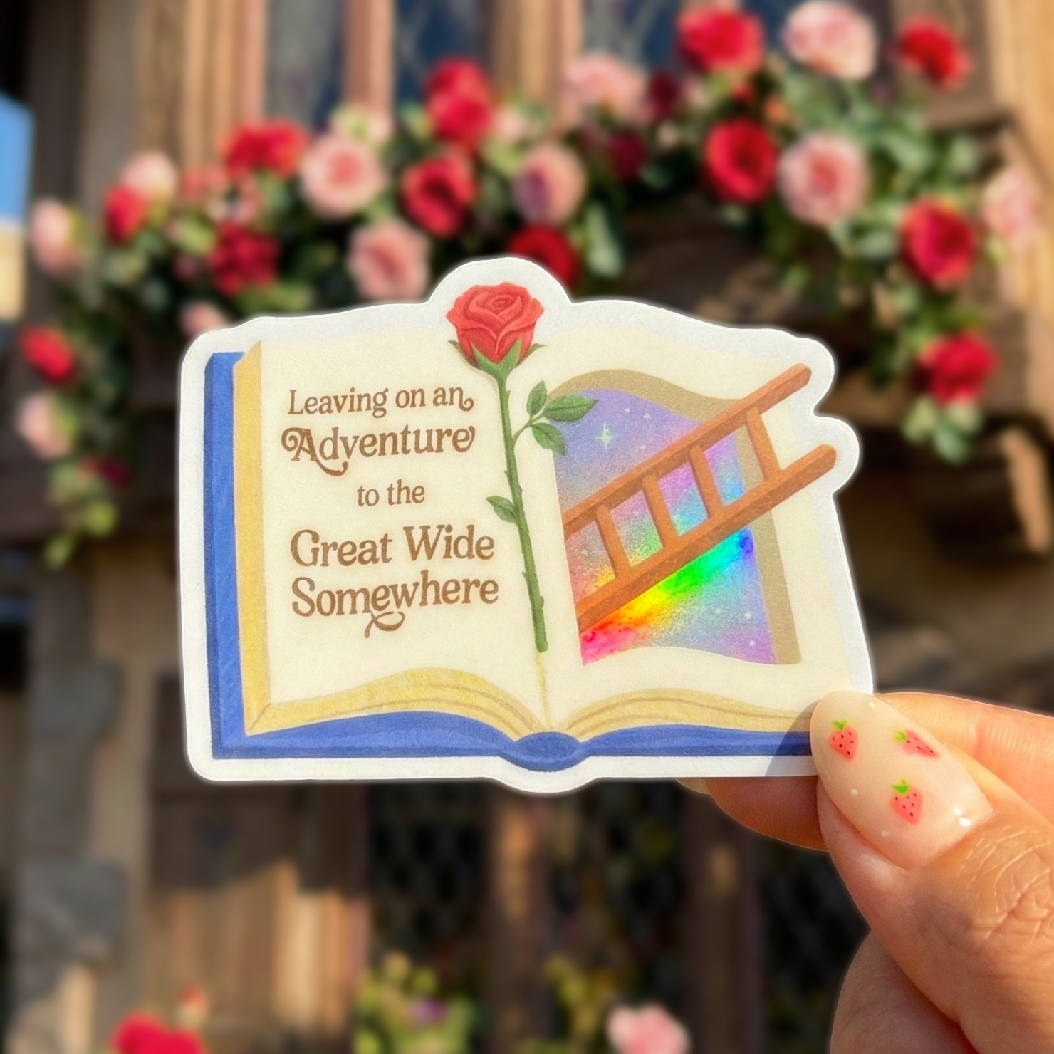 A book with a rose inspired by Beauty and the Beast. Climb down the librarian's ladder and leave on an adventure to the Great Wide Somewhere!