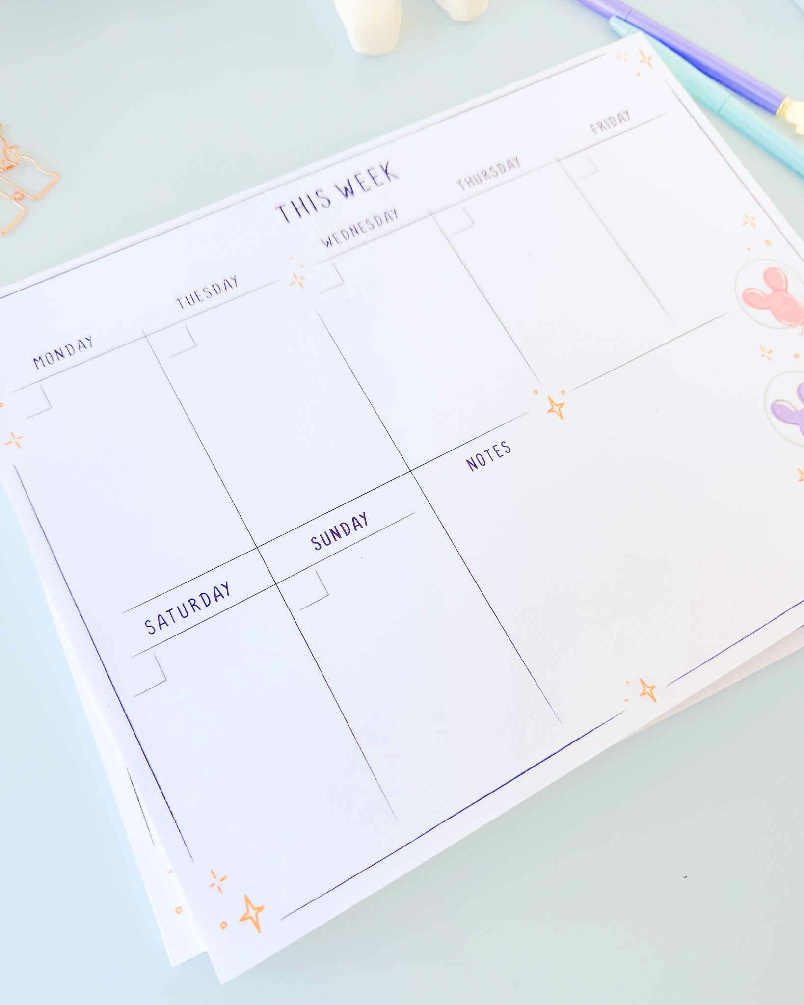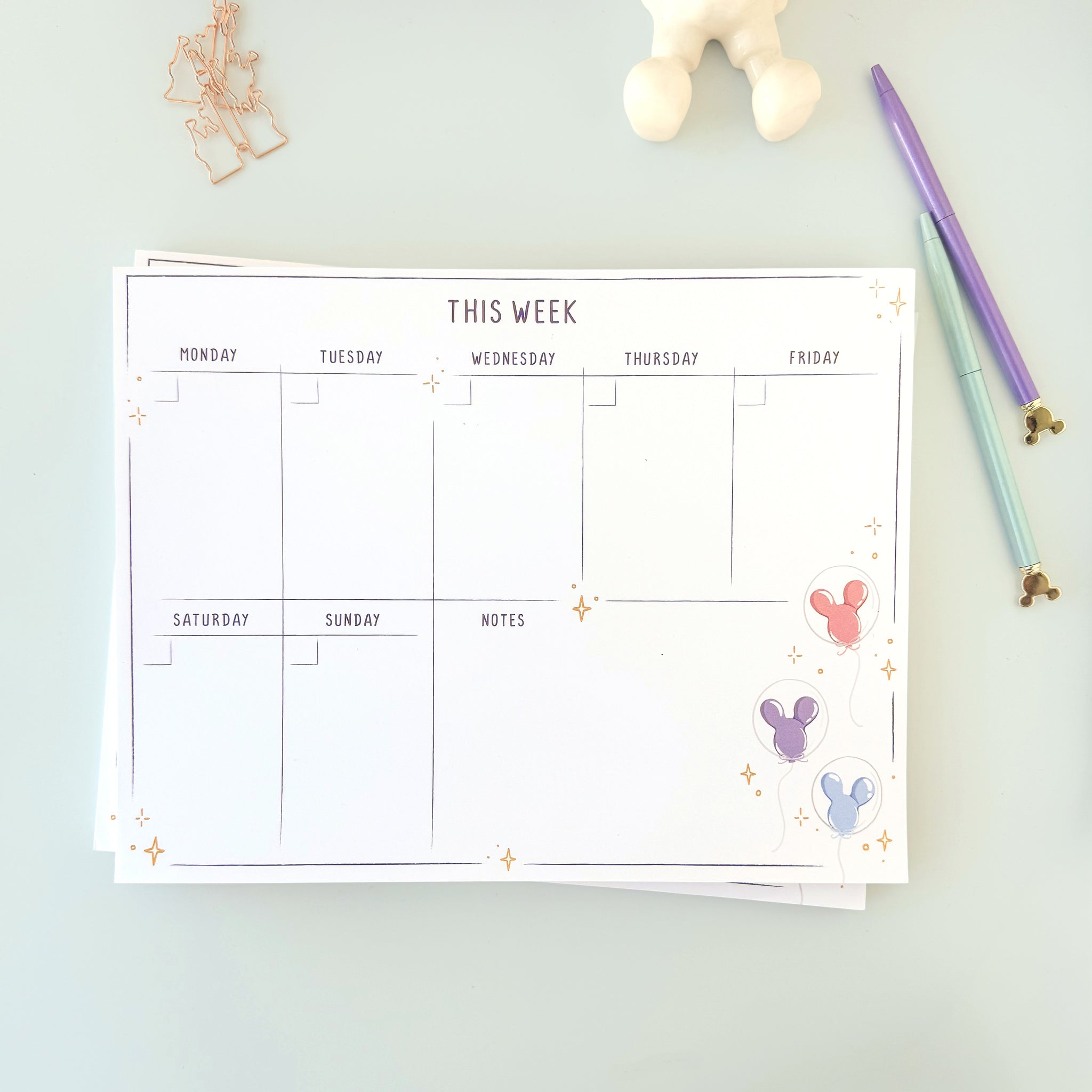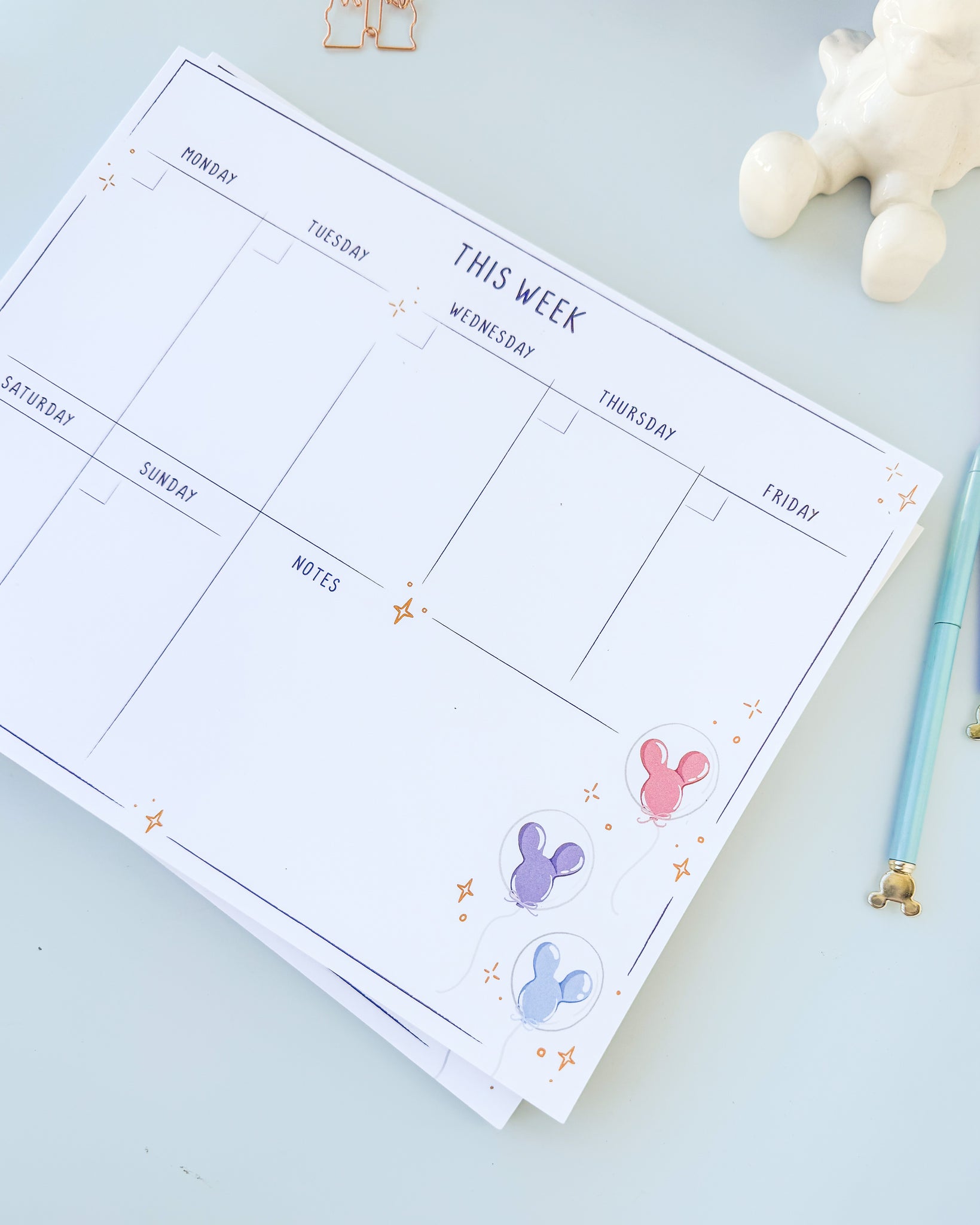 A whimsical Mickey balloon themed planner pad with a little bit of extra sparkle- plan your magical week with an added section for jotting down notes! This notepad allows you to have a little bit of your happy place where ever you are!