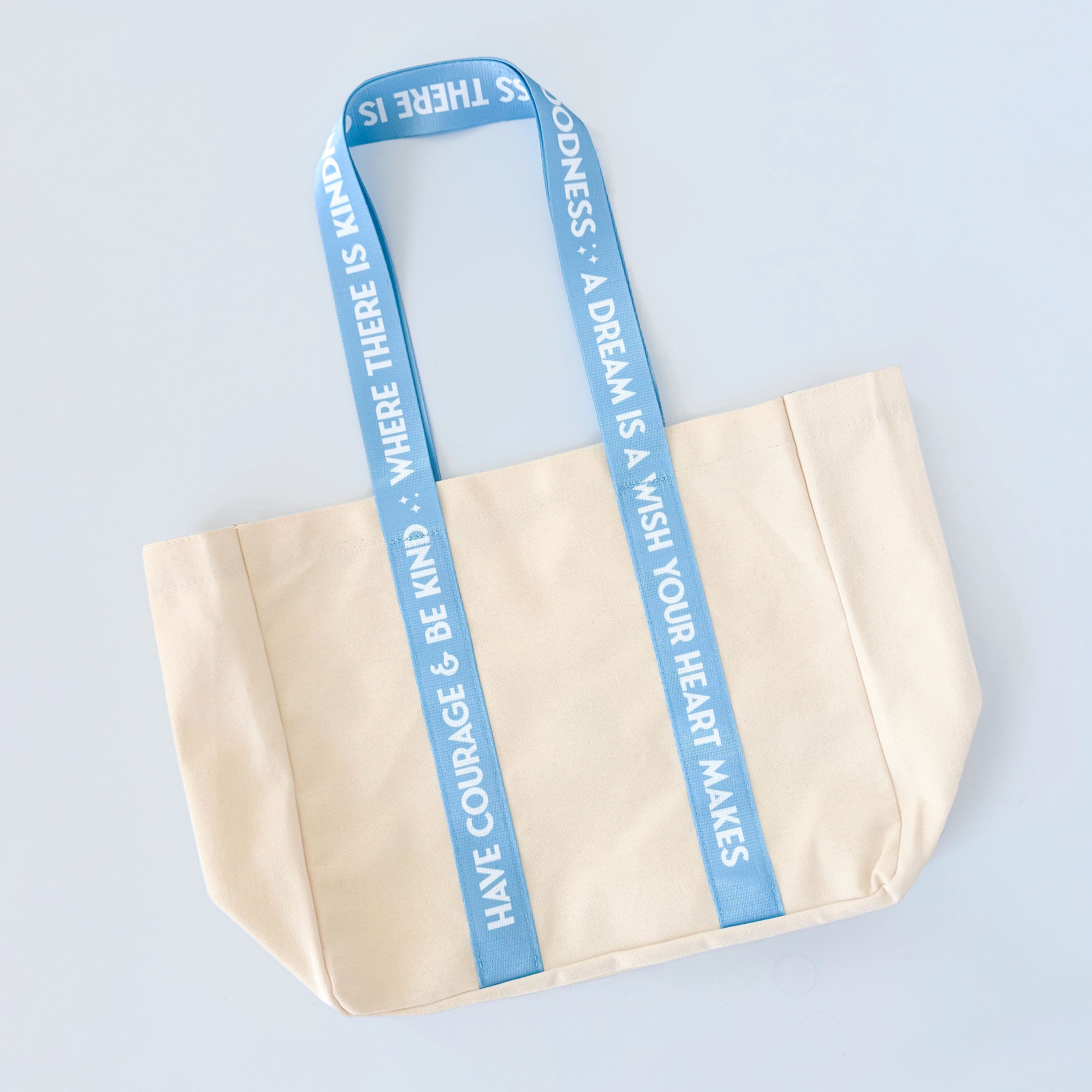 This sturdy tote is inspired by Cinderella. Text on the strap says: "Have Courage & Be Kind", "Where There Is Kindness There Is Goodness", and "A Dream Is A Wish Your Heart Makes".