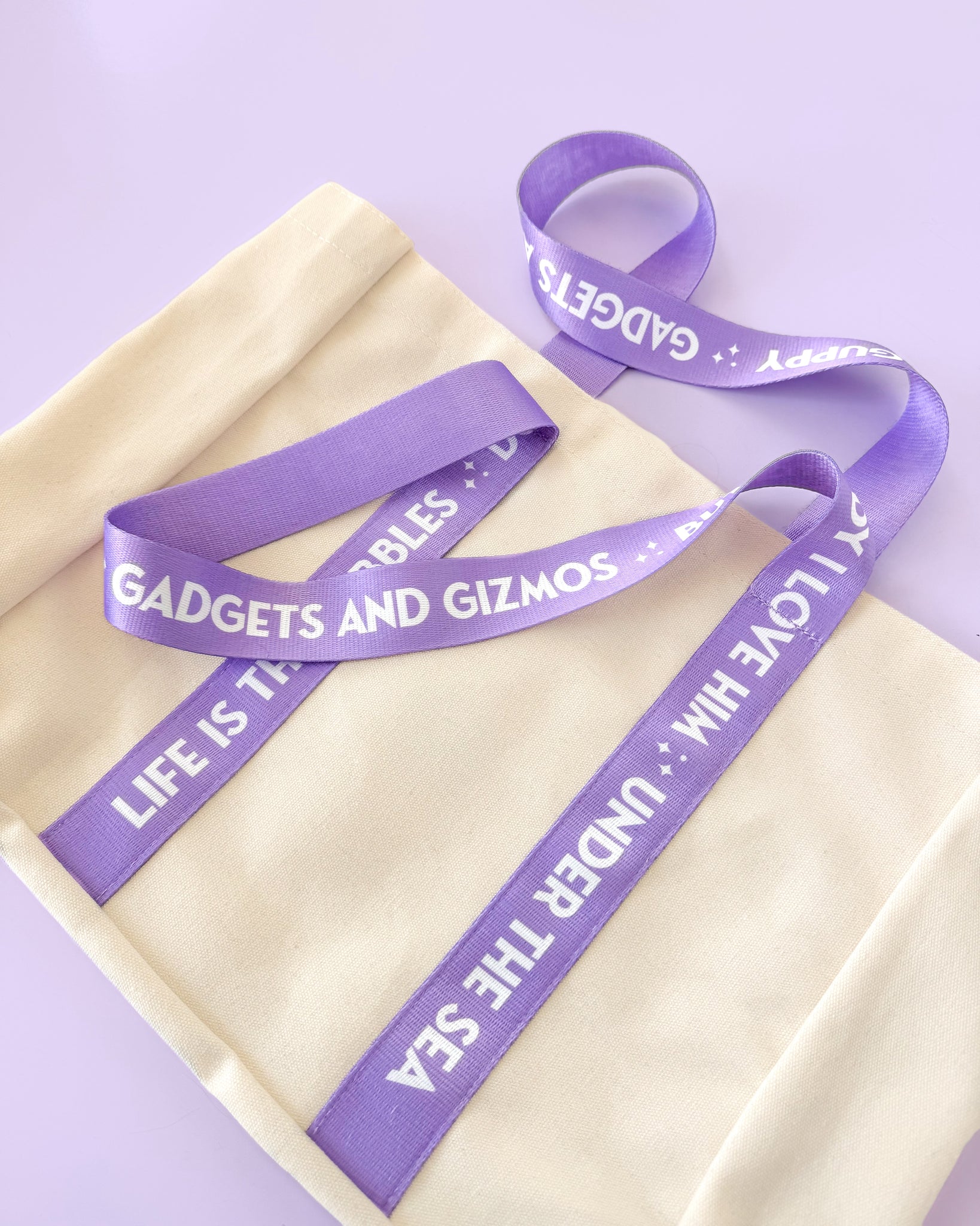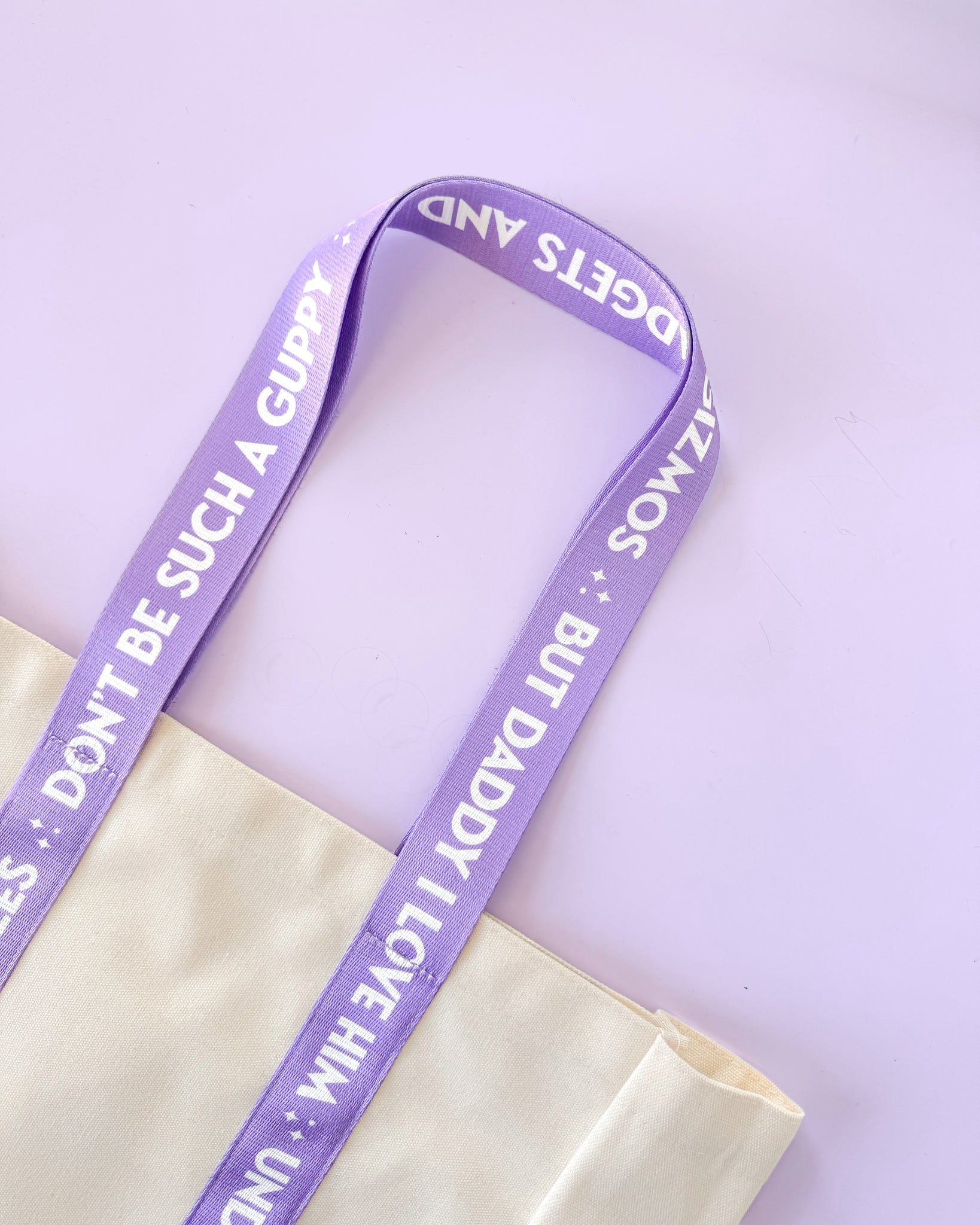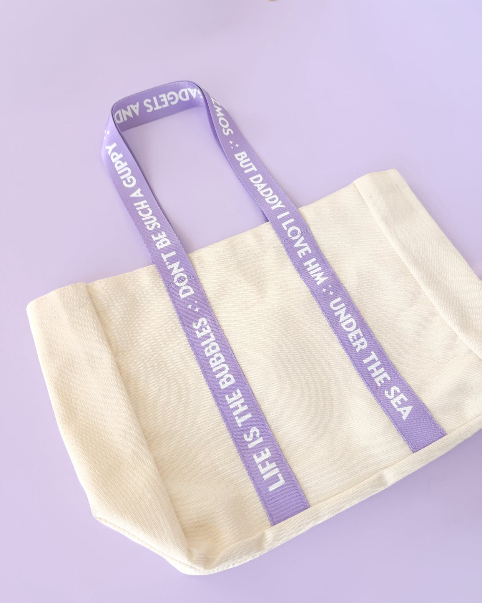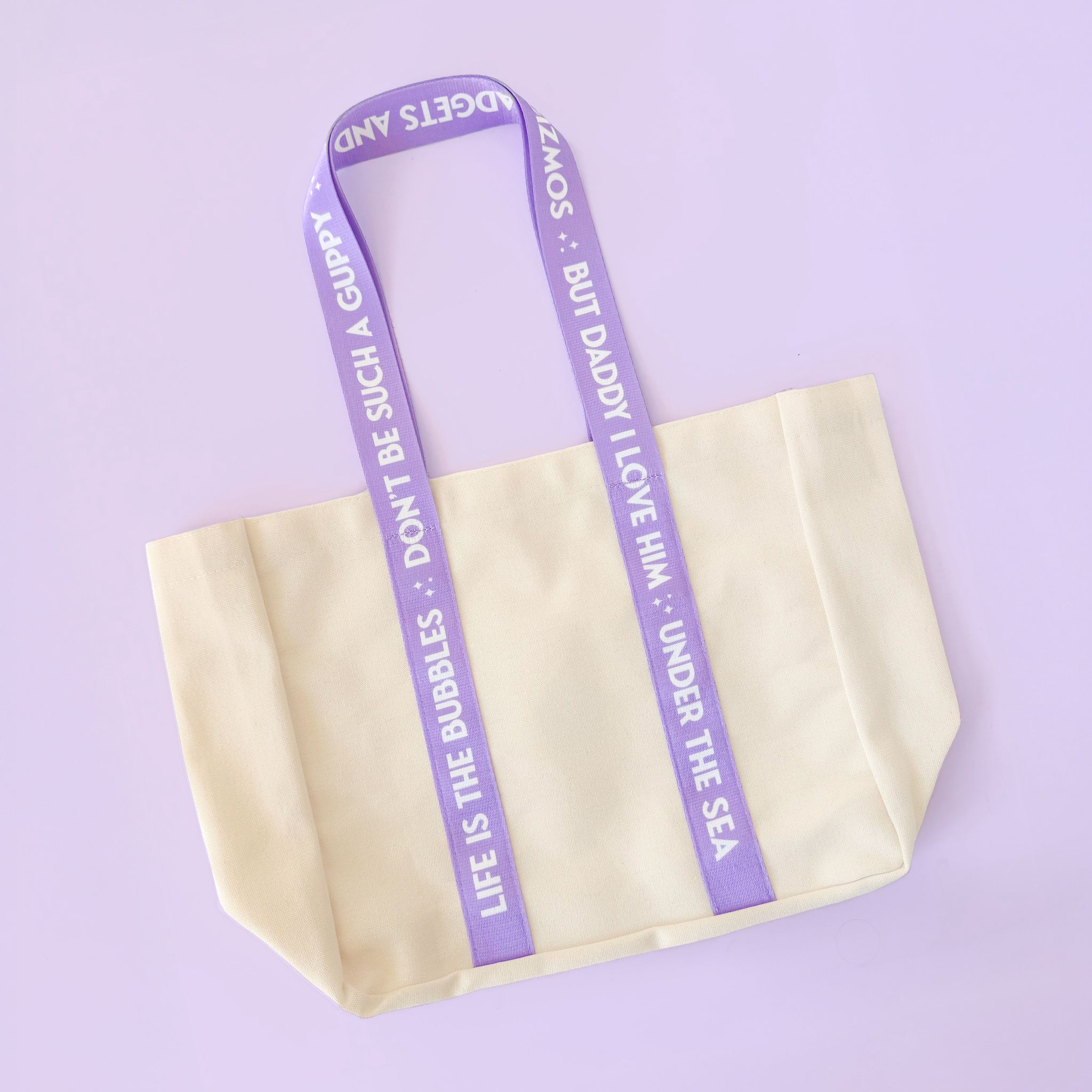 This sturdy tote is inspired by The Little Mermaid. Text on the strap says: "Life Is The Bubbles", "Don't Be Such A Guppy", "But Daddy I Love Him", and "Under The Sea".