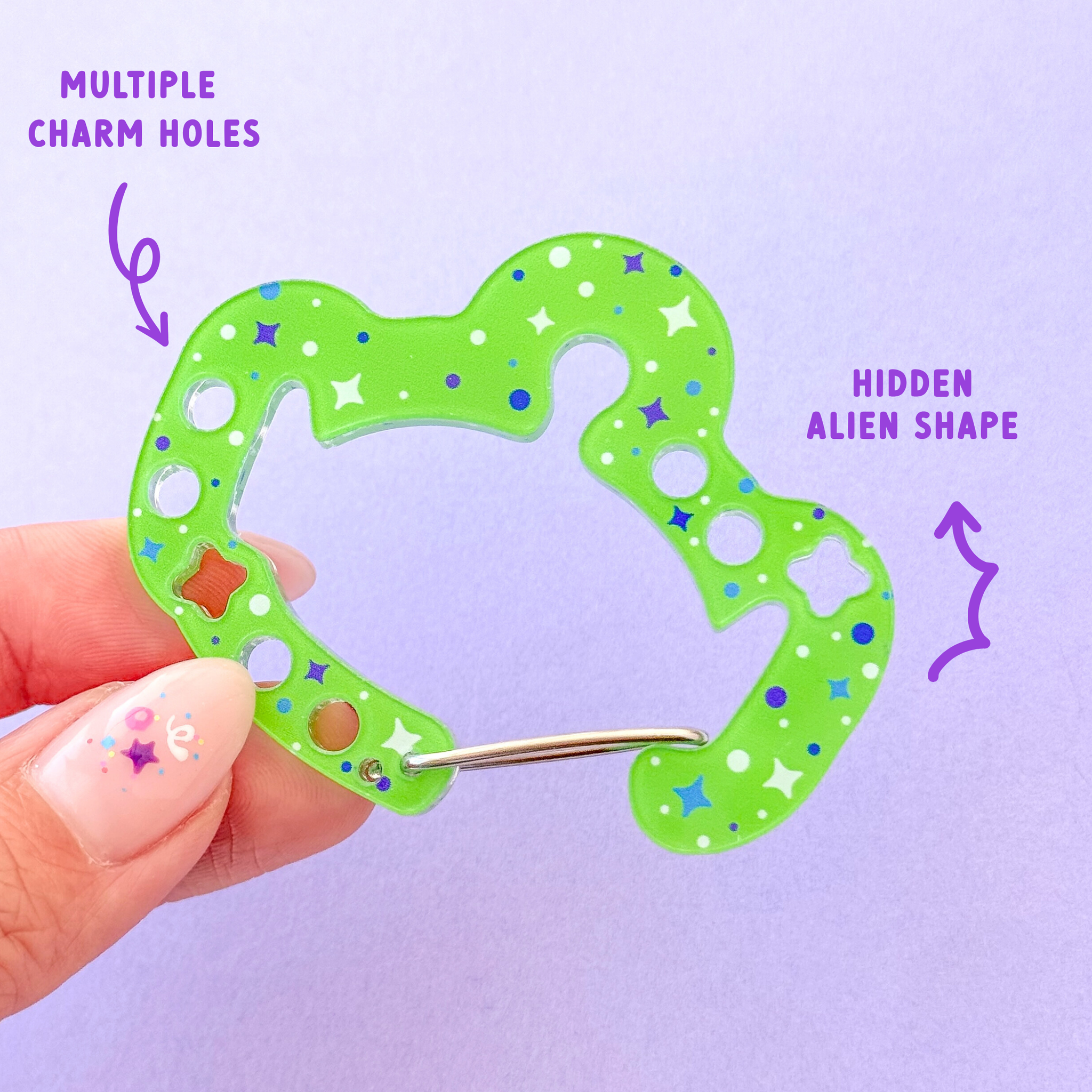 A fun hidden Aliens themed acrylic carabiner to help hold and organize all your charms! This carabiner hosts 8 extra charm hole slots (6 circular holes, 2 star shaped holes).