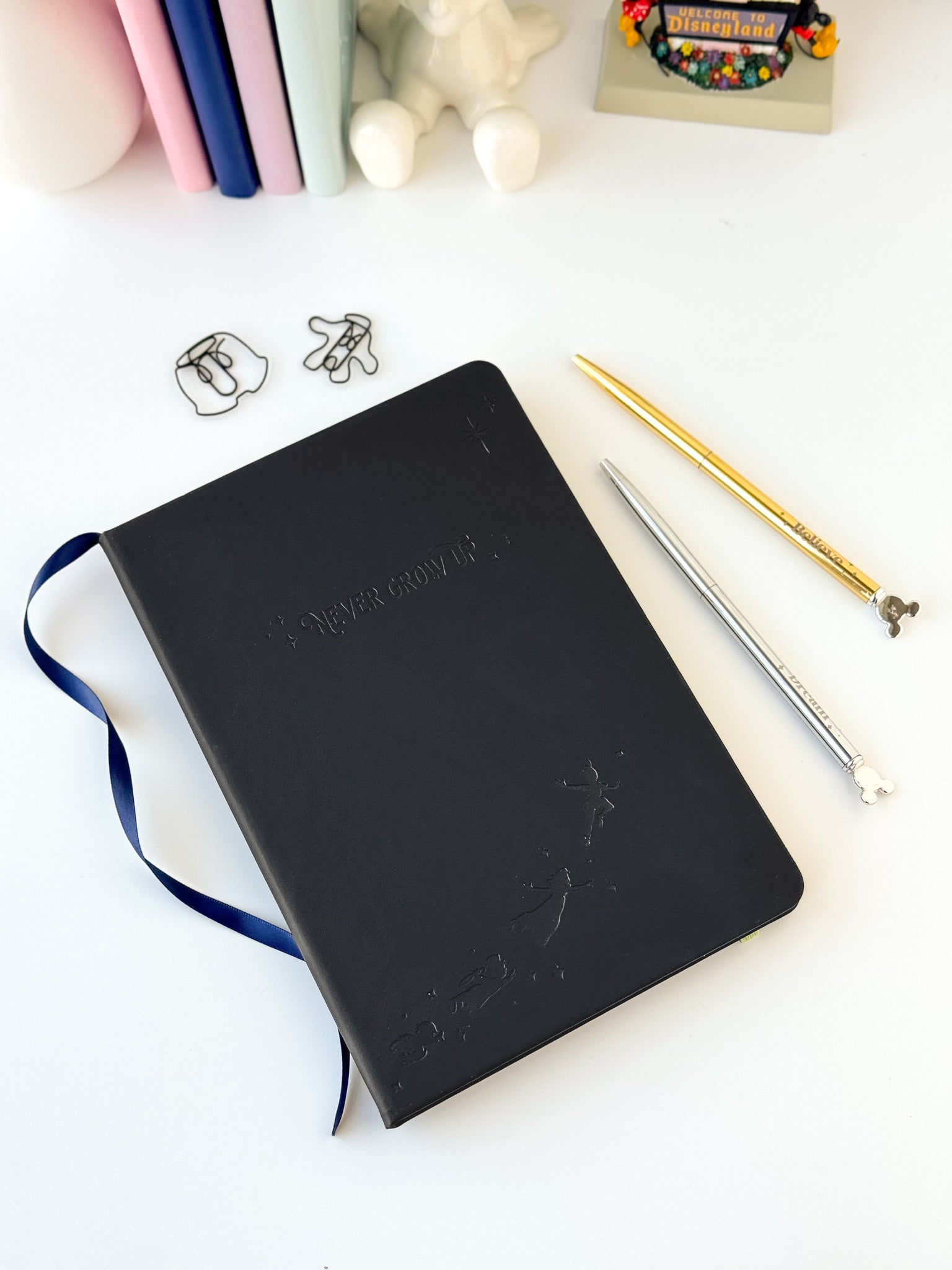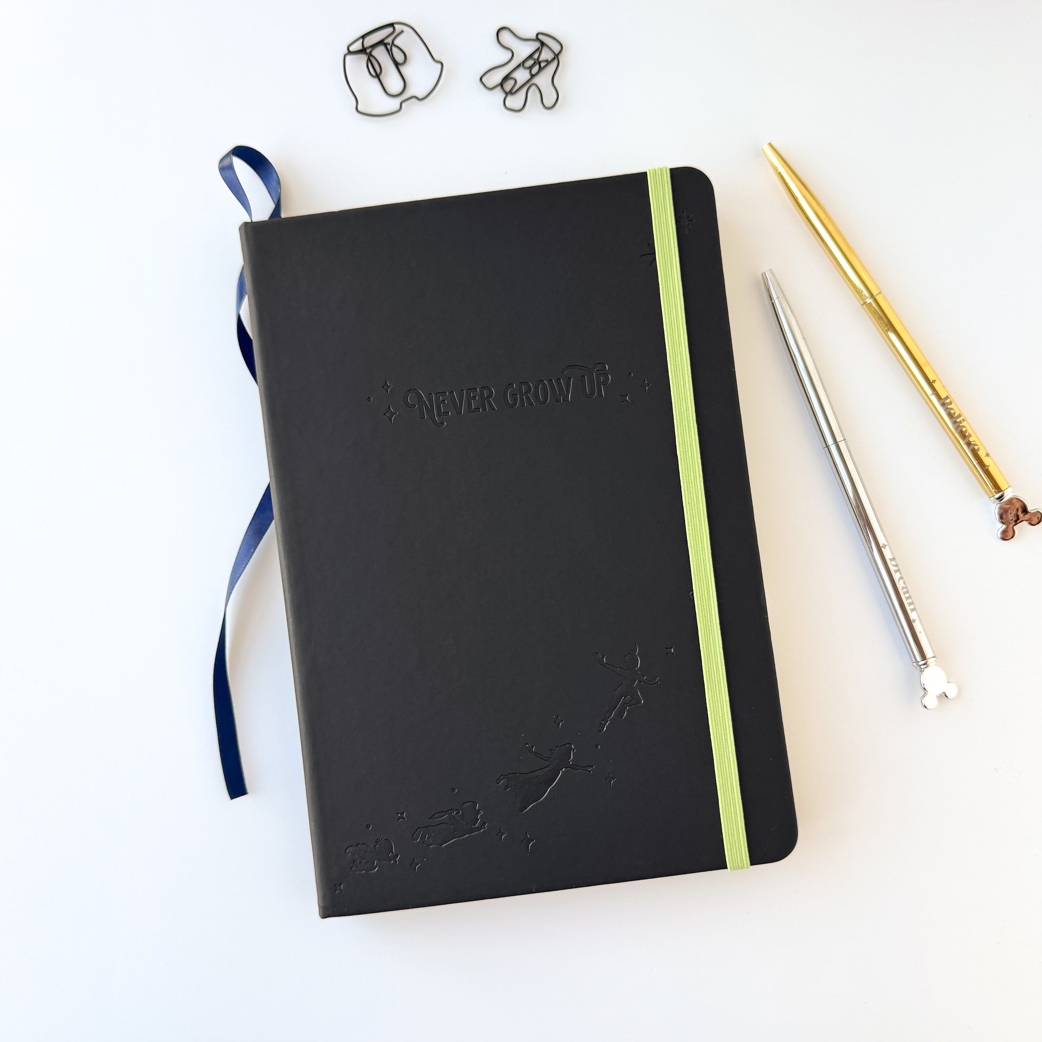 Never grow up. A subtle Peter Pan black notebook featuring a Peter and the Darlings embossed on the front cover with matching green elastic band and midnight blue satin ribbon. Each page on the inside is pixie dusted with sparkles.