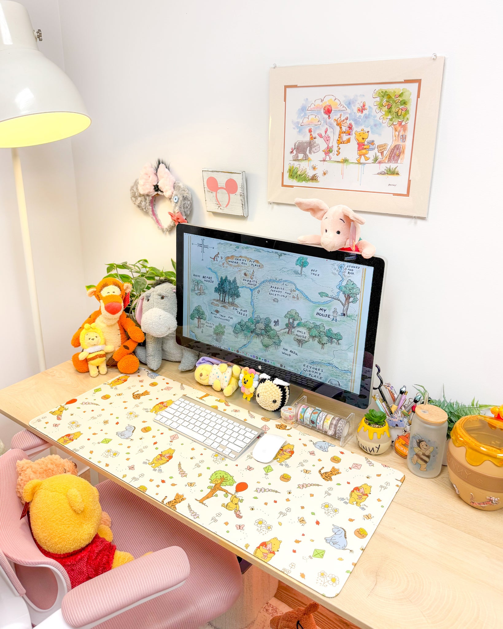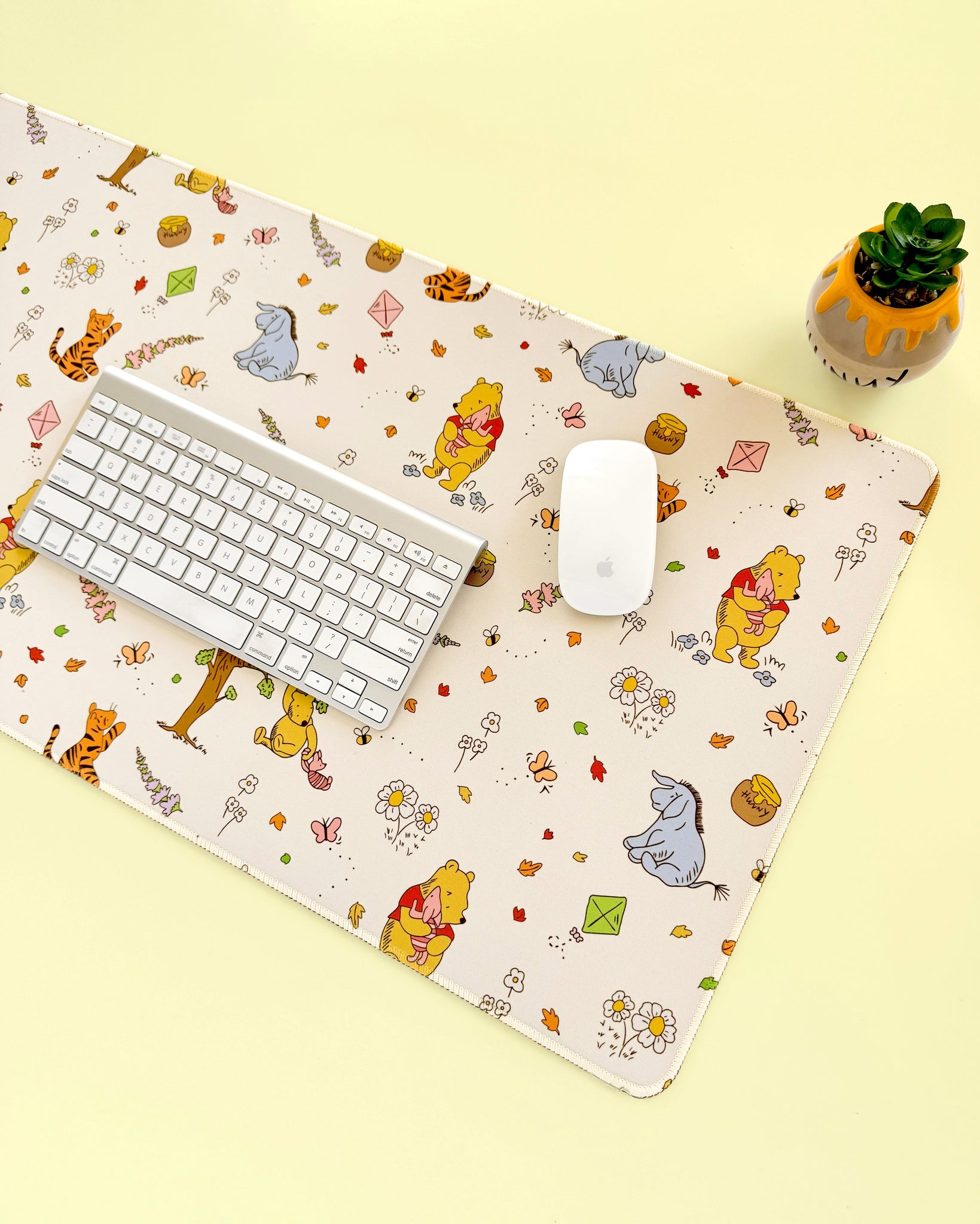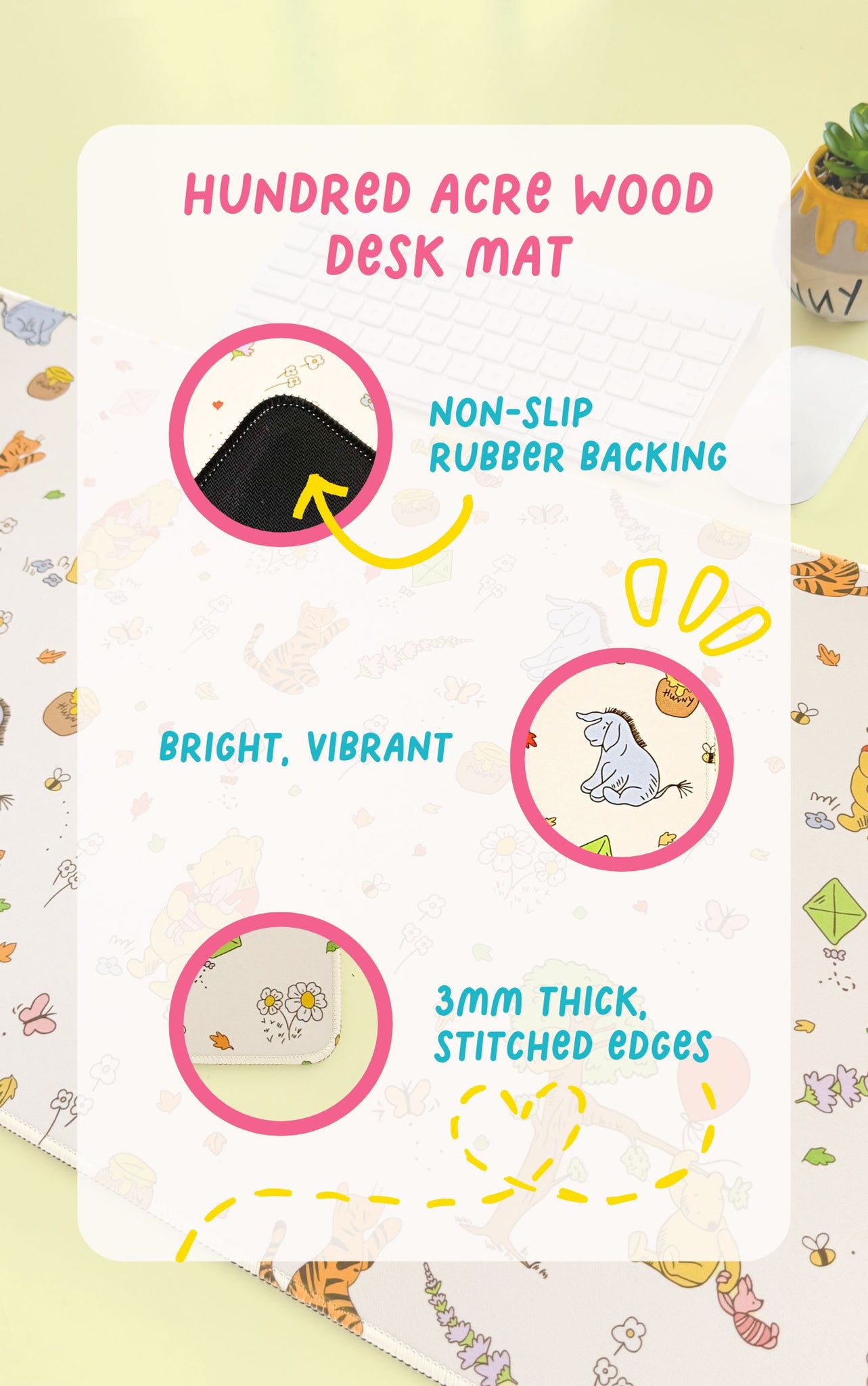 A classic Winnie The Pooh whimsy of Hundred Acre Wood in a desk mat! This nostalgic desk pad adds a touch of cozy and also protects your desk from any stains and scratches. Its non-slip rubber backing and smooth, low friction surface make for comfortable and precise mouse movements while keeping a firm surface that's still perfect for any pen and pencil moments.